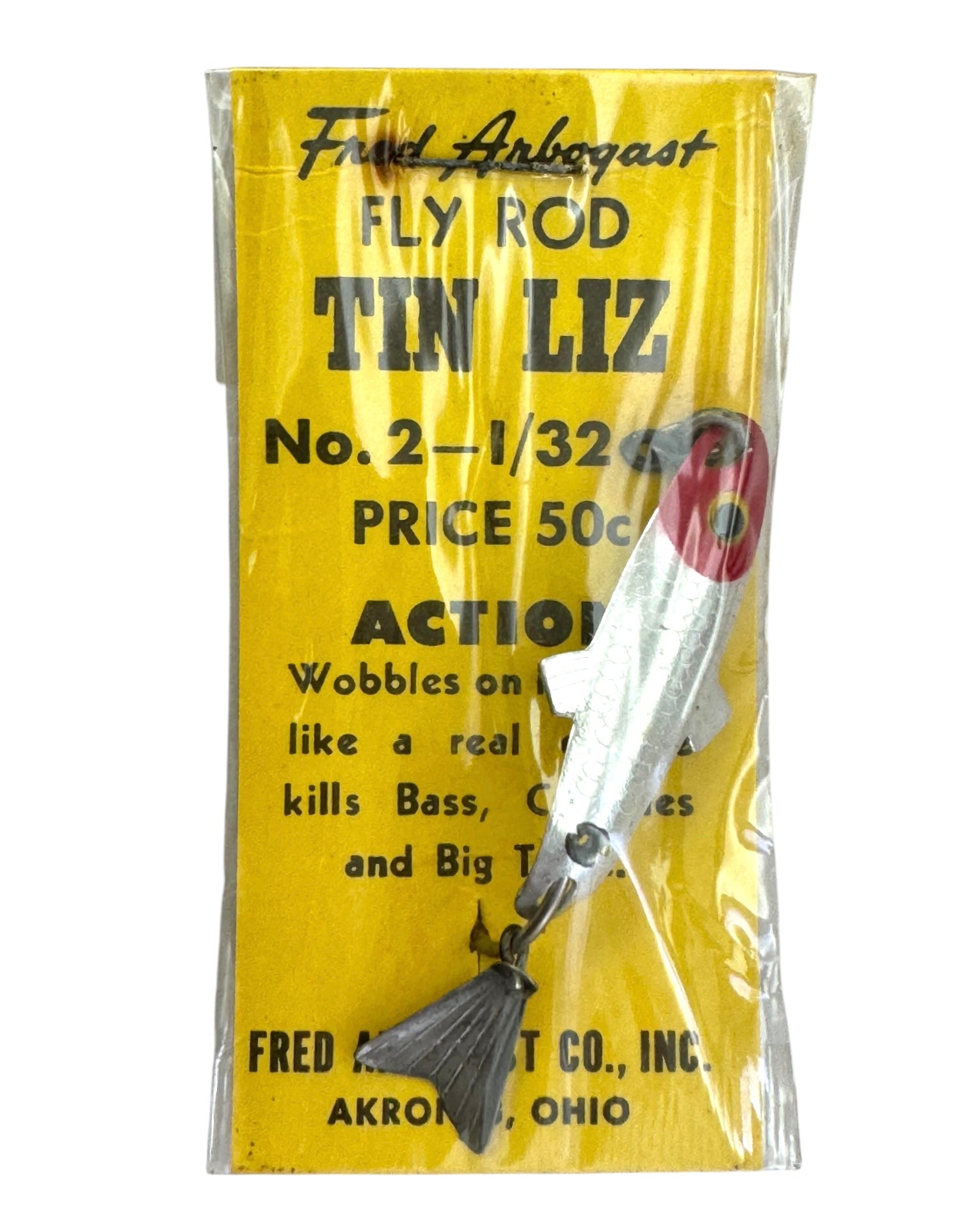 AKRON, OHIO • FRED ARBOGAST TIN LIZ VINTAGE FISHING LURE • No. 2 FLY ROD SIZE